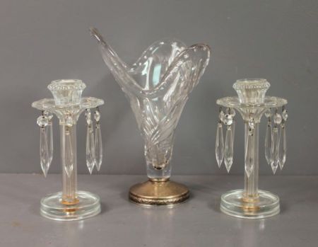 Vase (12" h.) and Two Glass Prism Candle Holders (9" h., some prisms missing) Vase (12" h.) and Two Glass Prism Candle Holders (9" h., some prisms missing)