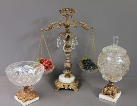 301 Made in Germany Fruit Scale Decoration with Marble Base and Two Glass Dishes with Marble Bases