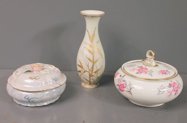 Vase (Ucagco Occupied Japan) 7 1/4" h. and Two Covered Dishes (one 6" Vase (Ucagco Occupied Japan) 7 1/4" h. and Two Covered Dishes (one 6"