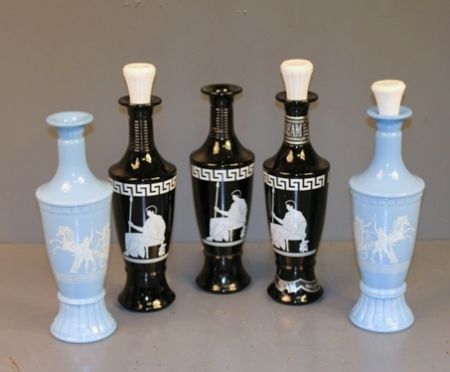 Five Kentucky Straight Bourbon Whiskey Decanters, Jim Beam; 14" h. Five Kentucky Straight Bourbon Whiskey Decanters, Jim Beam; 14" h.