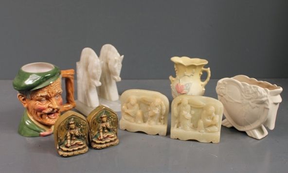 Group of Decorative Items, includes; glass horse head bookends, soapstone figurine bookends, Hu Group of Decorative Items, includes; glass horse head bookends, soapstone figurine bookends, Hu
