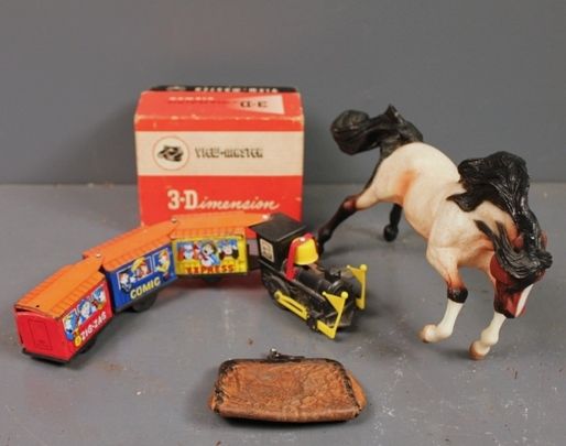 Group of Vintage Toys, includes; toy train, #D view Master, toy horse and pocket purse Group of Vintage Toys, includes; toy train, #D view Master, toy horse and pocket purse