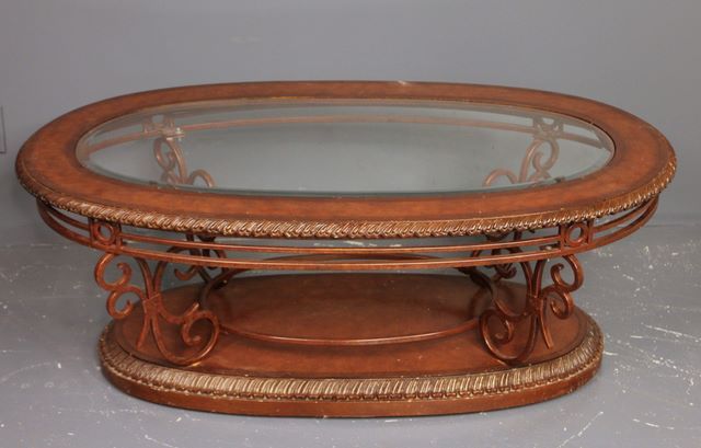 Glass Top Coffee Table; iron base 19" h., 50" w. Glass Top Coffee Table; iron base 19" h., 50" w.