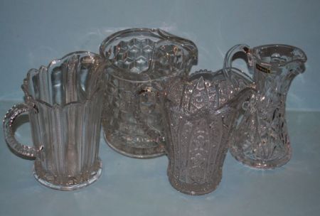 Four Glass Water Pitchers, largest 9" h. Four Glass Water Pitchers, largest 9" h.