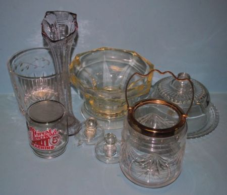 Group of Various Glassware items; two jars, vase, two dishes, covered dish Group of Various Glassware items; two jars, vase, two dishes, covered dish