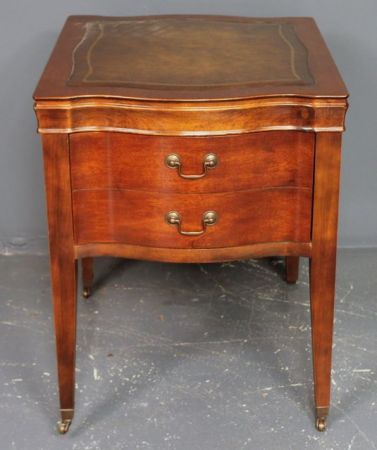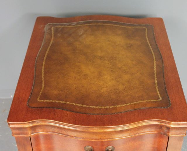 Leather Inlay Side Table with Brass feet (missing one insert). 26" h., 48" w. Leather Inlay Side Table with Brass feet (missing one insert). 26" h., 48" w.