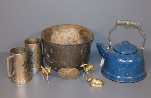 Speckleware Teapot, Brass, Two Mugs, Brass Bowl, Animals, Wild Turkey, Belt Buckle Speckleware Teapot, Brass, Two Mugs, Brass Bowl, Animals, Wild Turkey, Belt Buckle