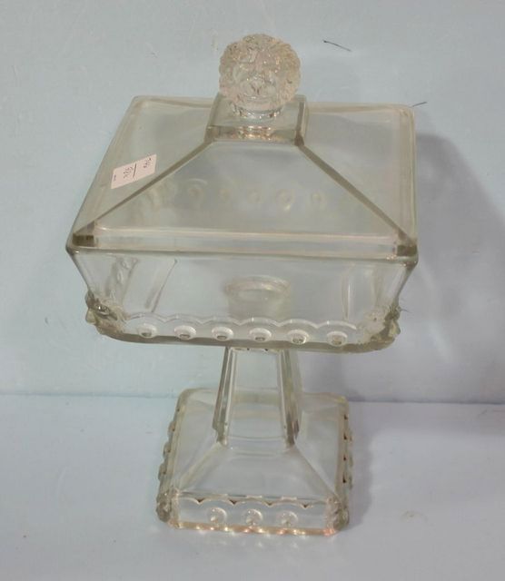 Early Pressed Glass Lidded Candy Jar; 12"h., 7" square Early Pressed Glass Lidded Candy Jar; 12"h., 7" square