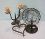 773 Candlesticks, Trivet and Basket Tin candlestick 5 1/2"h., iron candlestick 8"h., iron heart trivet 9 1/2"h., 6 1/2"w., and wire basket 3 1/2", 8 1/4" dia.