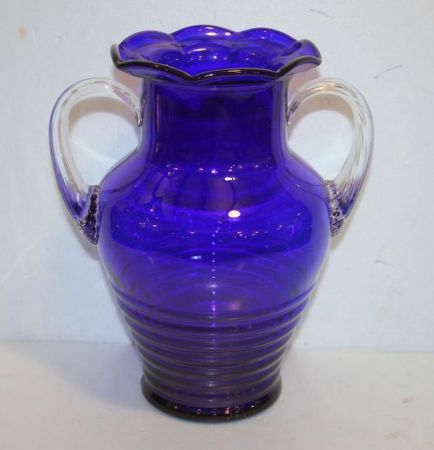 Cobalt Glass Vase with Clear Handles; 10" h. Cobalt Glass Vase with Clear Handles; 10" h.