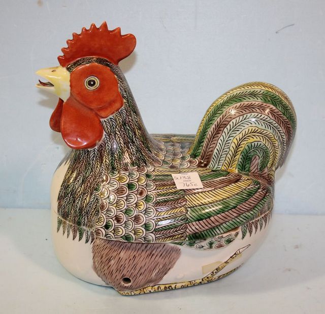 Hand Painted Porcelain Rooster on Nest; 10 1/2" h., 9 1/2" w. Hand Painted Porcelain Rooster on Nest; 10 1/2" h., 9 1/2" w.