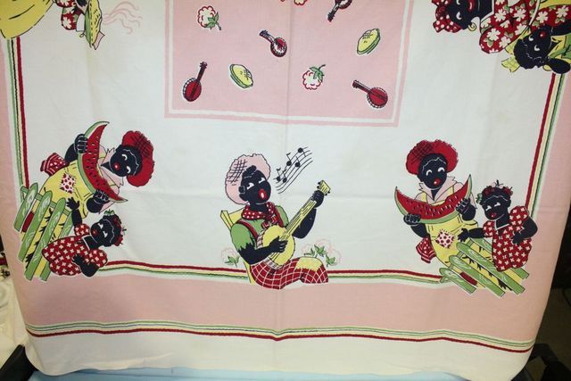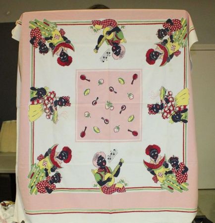 Vintage Black Americana Tablecloth Depicting Mammy and Child, African American with Banjo, small stain; 48" x 51" Vintage Black Americana Tablecloth Depicting Mammy and Child, African American with Banjo, small stain; 48" x 51"