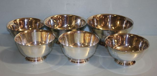 Three Rogers, Paul Revere Reproduction Bowls (two 5" dia., one 6" dia.) along with Three Reed and Barton Silverplate Bowls (two 5" dia., one 6" dia.) Three Rogers, Paul Revere Reproduction Bowls (two 5" dia., one 6" dia.) along with Three Reed and Barton Silverplate Bowls (two 5" dia., one 6" dia.)