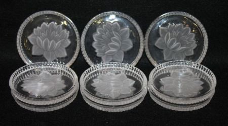 2461 Set of Nine Glass Coasters with Frosted Flower in Center