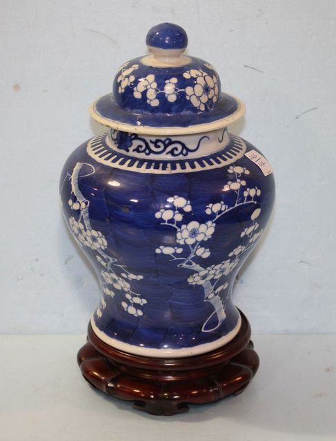 Blue and White Porcelain Ginger Jar, on wood base; 13 1/2" h. Blue and White Porcelain Ginger Jar, on wood base; 13 1/2" h.