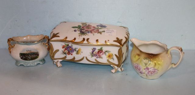 Made in Portugal hand painted Box (6 1/2" x 4" x 3"), St. Arold Vase (3 1/2" w., 2 1/2" h.) and a RS Germany Pitcher (3" h.) Made in Portugal hand painted Box (6 1/2" x 4" x 3"), St. Arold Vase (3 1/2" w., 2 1/2" h.) and a RS Germany Pitcher (3" h.)