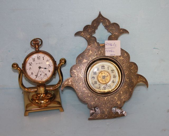 2526 1878 (USA) Brass Wind Clock and an Illinois Watch Company Pocket Watch on Stand