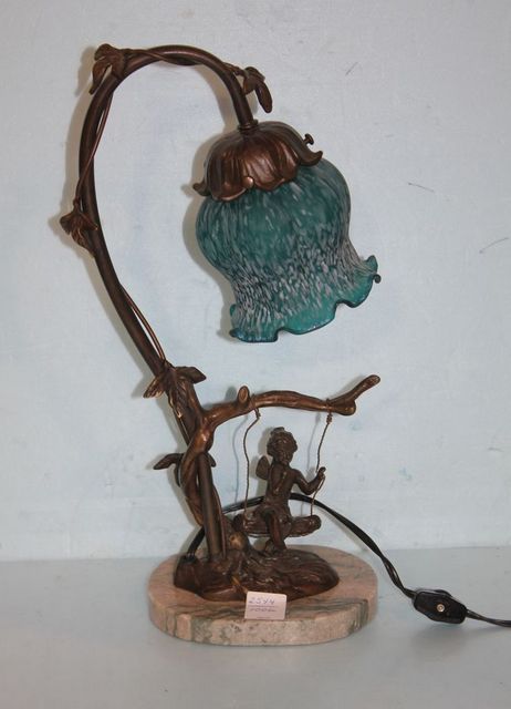 Decorative Spelter Figure of a Girl in a Swing, marble base, frosted aqua shade lamp; 15" h. Decorative Spelter Figure of a Girl in a Swing, marble base, frosted aqua shade lamp; 15" h.