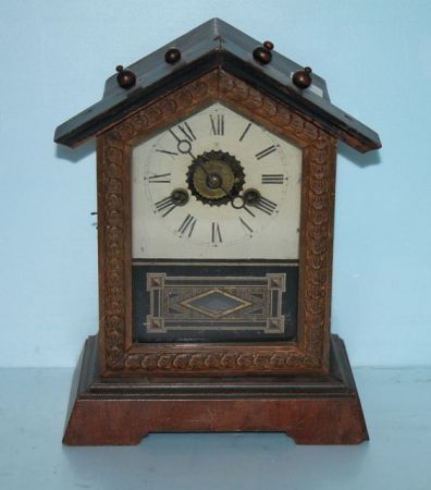 Small Wood Mantel Clock with Painted Glass Door; 11" h., 8 1/2" w. Small Wood Mantel Clock with Painted Glass Door; 11" h., 8 1/2" w.