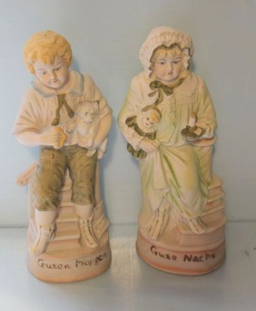 Pair of Bisque Statues, girl with doll and boy with puppy Pair of Bisque Statues, girl with doll and boy with puppy