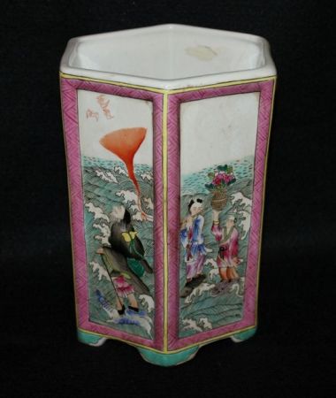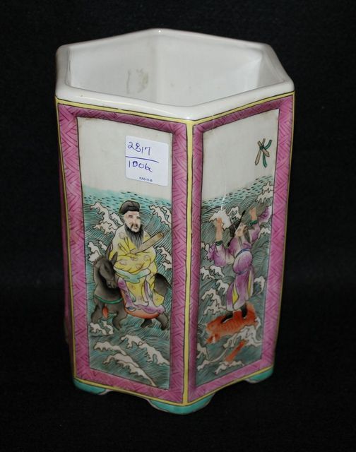 2817 Six Sided Hand Painted Vase with Oriental Motif