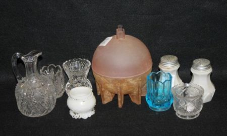 Nine Pieces of Glass; including five toothpick holders, milk glass salt and pepper, covered satin glass powder jar Nine Pieces of Glass; including five toothpick holders, milk glass salt and pepper, covered satin glass powder jar