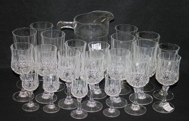 Twenty One Glasses (5" - 7" h.) along with Pitcher (8 1/2" h.) one glass has chip on base Twenty One Glasses (5" - 7" h.) along with Pitcher (8 1/2" h.) one glass has chip on base