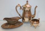 Group of Silverplate Items; tea pot 10" h., sugar, gravy boat Group of Silverplate Items; tea pot 10" h., sugar, gravy boat