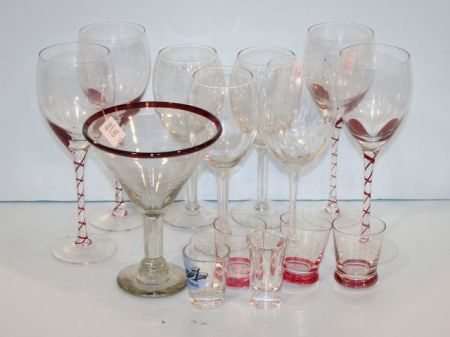 Group of Glass Items, which includes; four red and clear stems 9 1/2" h., one 7" glass, four various stems, five shot glasses Group of Glass Items, which includes; four red and clear stems 9 1/2" h., one 7" glass, four various stems, five shot glasses