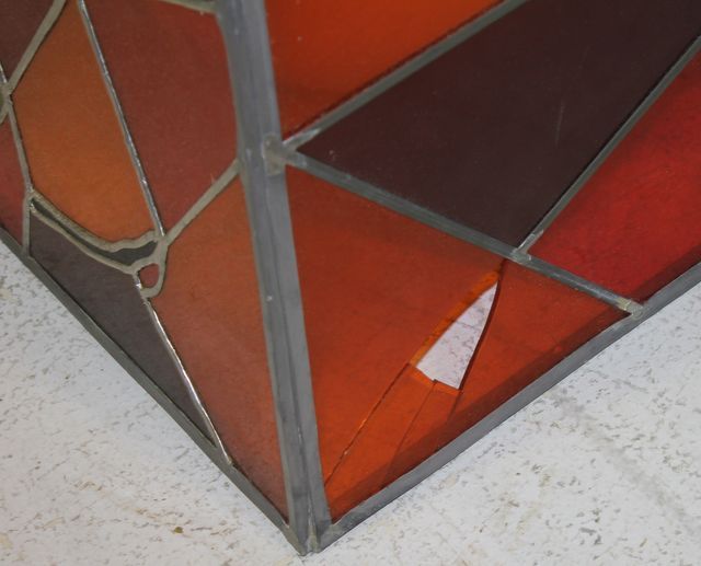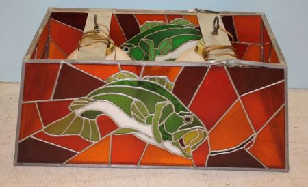 Stain Glass Hanging Lamp with Fish, four panes cracked or broken; 28 1/4" w., 15" d., 13 1/2" h. Stain Glass Hanging Lamp with Fish, four panes cracked or broken; 28 1/4" w., 15" d., 13 1/2" h.