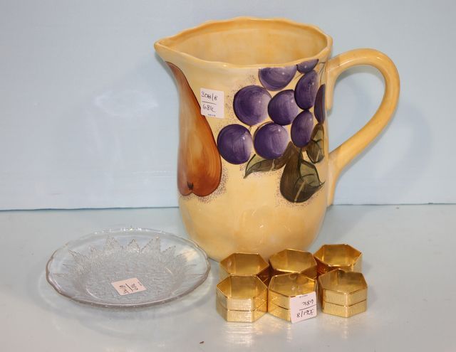 3061 Set of Six Napkin Rings, Glass Dish and a Painted Ceramic Pitcher