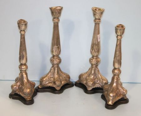 Set of Four Silver Metal Candlesticks; 11 1/2" h., 12 1/2" h. Set of Four Silver Metal Candlesticks; 11 1/2" h., 12 1/2" h.