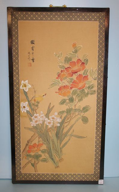 Hand Painted Oriental Scene on Paper; 19' w., 35" h. Hand Painted Oriental Scene on Paper; 19' w., 35" h.