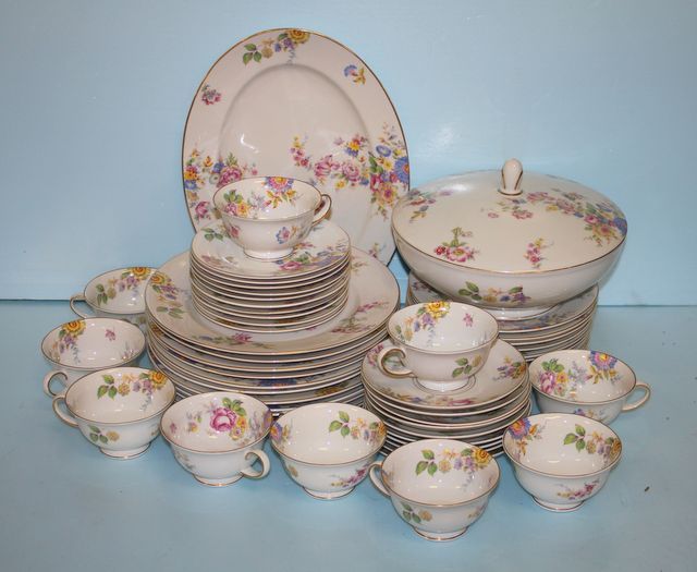 Set of Rosenthal "Aida" German China, which includes; ten dinner plates, ten salad plates, ten desert plates, ten cups, ten saucers, oval platter, round covered vegetable; total 52 pieces Set of Rosenthal "Aida" German China, which includes; ten dinner plates, ten salad plates, ten desert plates, ten cups, ten saucers, oval platter, round covered vegetable; total 52 pieces