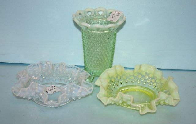3128 Two Victorian Glass Ruffle Edge Dishes along with a Victorian Glass Vase