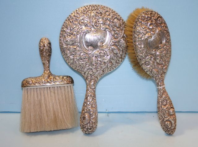 Three Piece Sterling Reposse Set, brush, mirror, clothes brush Three Piece Sterling Reposse Set, brush, mirror, clothes brush