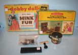 Two Stand up Debby Dolls, Miniature Furniture Kits, Stamp, Vintage Small Porcelain Animals; 1/2"-3" h. Two Stand up Debby Dolls, Miniature Furniture Kits, Stamp, Vintage Small Porcelain Animals; 1/2"-3" h.