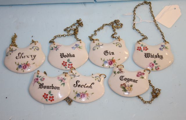 3259 Set of Seven Limoge Porcelain Hand Painted Decanter Tag Labels with Chain