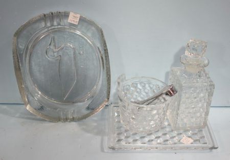 Four Pieces of Press Glass, which include; ice bucket, large ash tray (with duck) 11 1/2" w., rectangular tray 10 7/8" l., decanter, Richard North Patterson "Fall From Grace" Four Pieces of Press Glass, which include; ice bucket, large ash tray (with duck) 11 1/2" w., rectangular tray 10 7/8" l., decanter, Richard North Patterson "Fall From Grace"