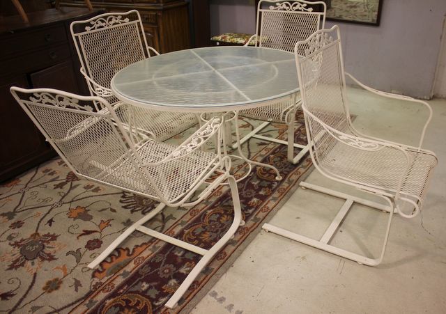 Iron Patio Table with Glass Top 42" dia., and Four Arm Chairs Iron Patio Table with Glass Top 42" dia., and Four Arm Chairs
