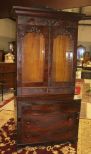 1840 Empire Mahogany Two Part Secretary, having two glass doors, elaborate carving, bottom section has fold over writing area over three drawers; 41 1/2" w., 21" d., 85" h. 1840 Empire Mahogany Two Part Secretary, having two glass doors, elaborate carving, bottom section has fold over writing area over three drawers; 41 1/2" w., 21" d., 85" h.