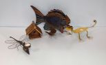 Metal lizard, metal dragonfly, metal butterfly, metal fish & wood birdhouse Metal lizard, metal dragonfly, metal butterfly, metal fish & wood birdhouse