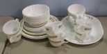 Five Corelle dinner plates, platter, three salad bowls, seven cups/saucers, seven cereal bowls & seven buillion cups Five Corelle dinner plates, platter, three salad bowls, seven cups/saucers, seven cereal bowls & seven buillion cups