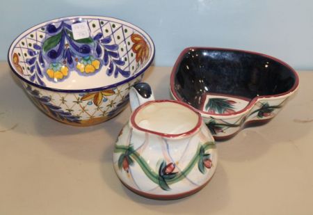 Painted ceramic bowl 8 1/2" dia., painted ceramic pitcher & ceramic heart shaped dish Painted ceramic bowl 8 1/2" dia., painted ceramic pitcher & ceramic heart shaped dish