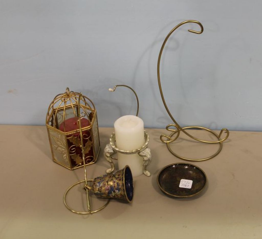 Candlesticks, hanging candle, hanging bell & 6" Cloisonne dish Candlesticks, hanging candle, hanging bell & 6" Cloisonne dish