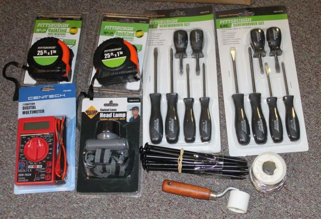 Two Pittsburgh tape measures, two screwdriver sets, digital multimeter, headlamp, spikes & wire Two Pittsburgh tape measures, two screwdriver sets, digital multimeter, headlamp, spikes & wire