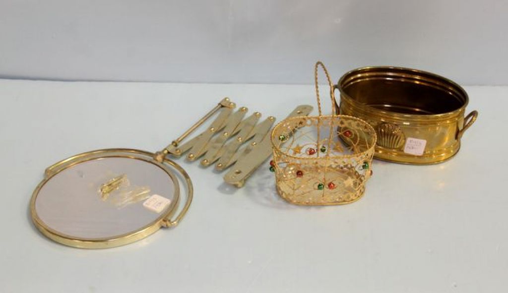 819 Swinging Brass Mirror & Two Small Brass Baskets