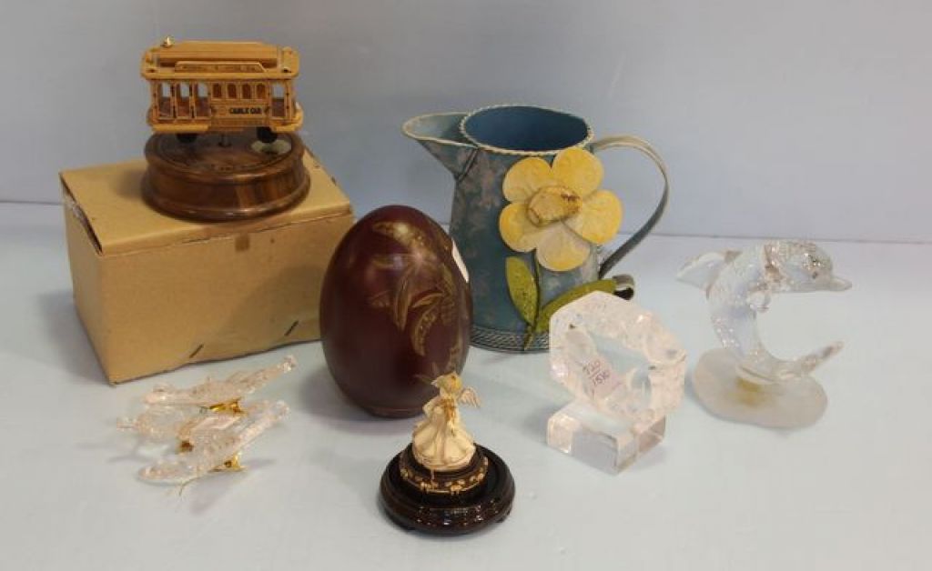Tin watering pitcher, Taiwan glass dolphin, paperweight, wood egg, wood cable car & box of glass vases Tin watering pitcher, Taiwan glass dolphin, paperweight, wood egg, wood cable car & box of glass vases
