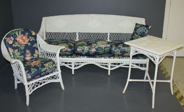 Wicker Patio Set, Couch, Arm Chair and Table; couch 35" h., 81" l., 22" d. Wicker Patio Set, Couch, Arm Chair and Table; couch 35" h., 81" l., 22" d.
