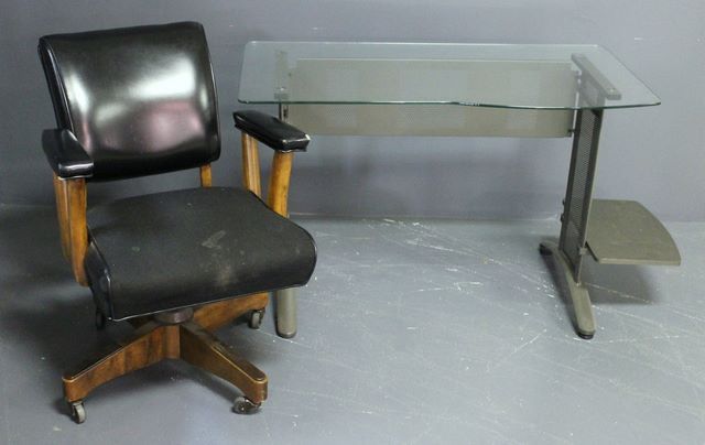 Glass Top Computer Desk and Black Swivel Office Chair, chair has some stains; desk 30" h., chair 35" h. Glass Top Computer Desk and Black Swivel Office Chair, chair has some stains; desk 30" h., chair 35" h.